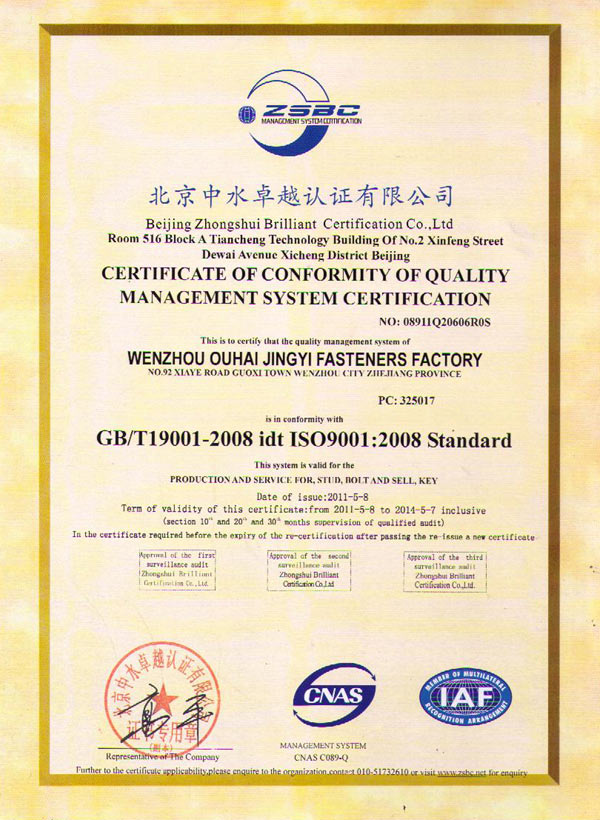 本厂位于亚洲著名紧固件生产基地—温州。始建于1989年,自成立以来,我厂始终致力于紧固件的研制和开发,形成了以生产紧固件为主,多元经营的产业格局,我厂通过ISO9001-2008质量管理体系认证。销售网络遍布全国各地,深受顾客欢迎。 |